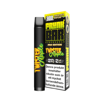 Frunk Bar Twisted Apple ger ca 800 puffar. Den är en engångsvape, vilket är en disponibel VAPE som varken behöver laddas eller fyllas på med ny vätska. Frunk Bar kommer i flera olika smaker, alla med en styrka på 20 mg och en vätskekapacitet på 2 ml. Varje enhet räcker till ca 800 puffar, och kommer förladdad med ett batteri på 420 mAh. Frunk Bar Twisted Apple använder sig av Mesh Coil, vilket ger en jämnare och mer långvarig smak och ånga, mer likt traditionella och mer avancerade enheter.