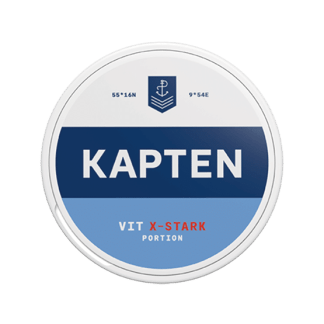 Kapten Vit Extra Stark Portionssnus har smak som består av bergamott och tobaksnära aromer. Prillorna har formatet Large. Kapten Vit Extra Stark Portionssnus har nikotinstyrka 4 med 15 mg nikotinhalt per prilla, vilket blir en nikotinhalt på 1,7%. Varje prilla väger 0,9 gram och en dosa innehåller 20 stycken prillor. Kapten är ett varumärke som tillverkas av Swedish Match.