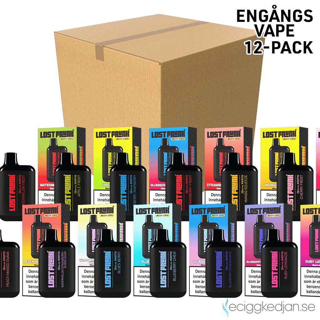 Komplett paket av alla 12 smaker av Lost Frunk. Paketet innehåller 12st engångvapes.