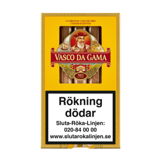 Vasco Da Gama No 2 Capa De Oro Caribbean är maskinrullade cigarrer i paket från Tyskland. Varje paket innehåller 5 stycken cigarrer. Vasco da Gama No. 2 har en noga utvald tobak från Brasilien och Kuba.