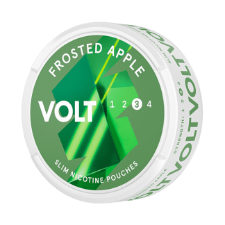 VOLT Frosted Apple Slim Strong har en smak av gröna äpplen i kombination med kylande mint och lite vanilj. VOLT är nikotinpåsar utan tobak som kommer i flera smaker och former.